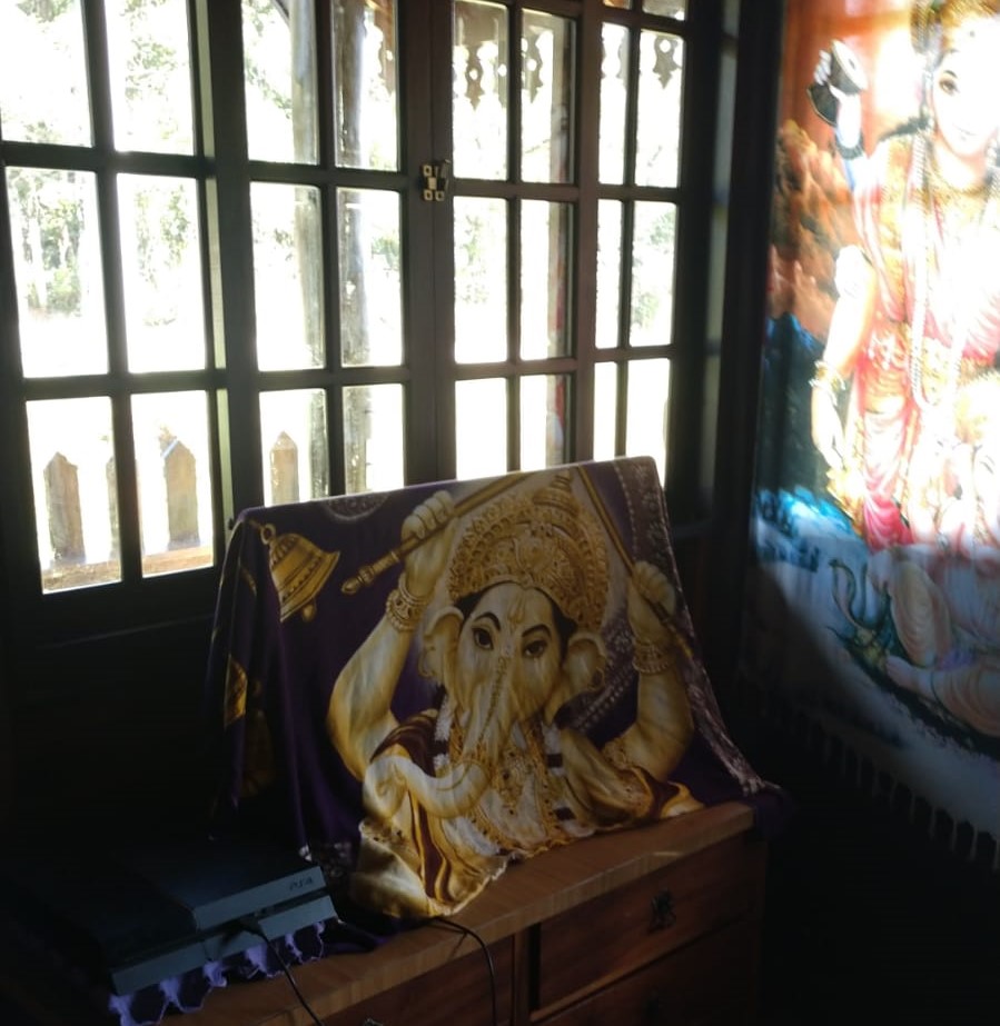 Ao olhar essa foto, de um vídeo game, uma tv coberta por uma canga em cima de um móvel antigo, janelas ainda sem cortinas, uma outra canga em uma destas, o sol entrando pela janela frontal e os detalhes do telhado aparecendo através dela, para outros pode ser apenas uma foto do pedaço de uma casa qualquer, em uns pode emergir algum conteúdo interno específico e para mim são longos capítulos de contos diversos. Certas passagens me vem a mente ao buscar a forma que me relaciono com cada um desses objetos que aparecem aí, mas para desenvolver em algum sentido escolhi a tv coberta por esta canga de Ganesha.